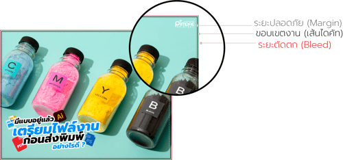 เราควรกำหนดค่าระยะ Bleed (ระยะตัดตก) กับ Margin (ระยะห่างของขอบกระดาษ) อยู่ที่ 2 mm. ซึ่งเป็นระยะพื้นที่ปลอดภัยในการวางข้อความ